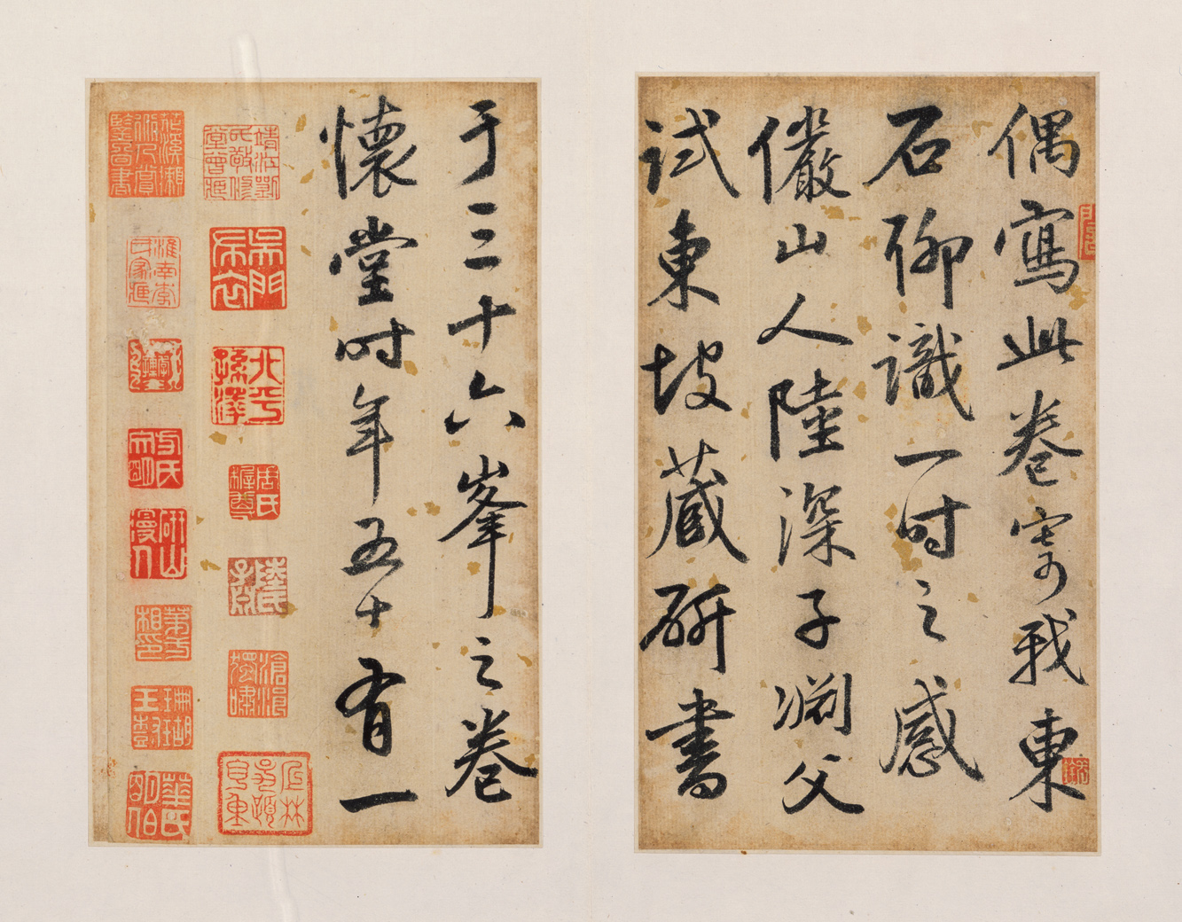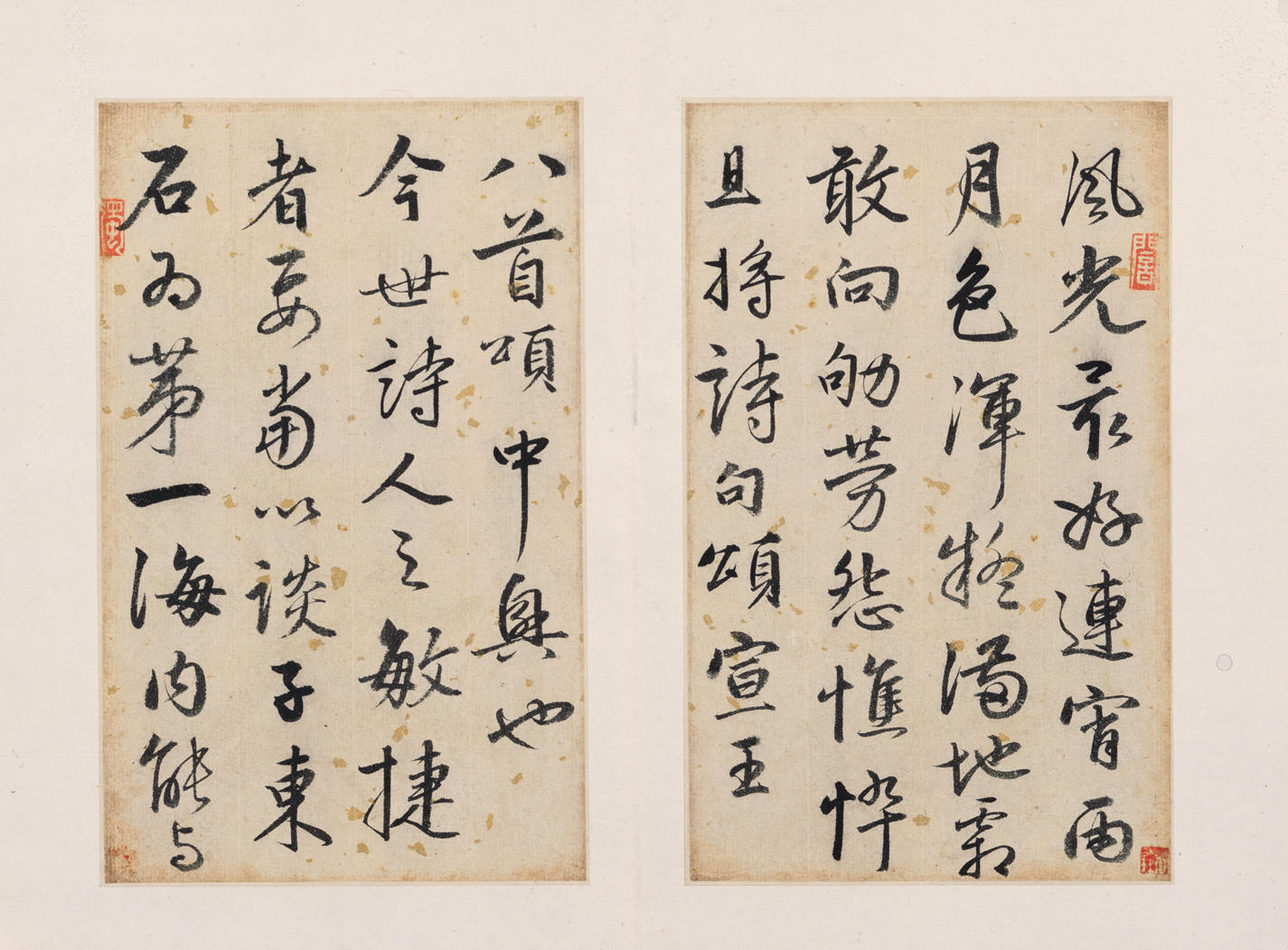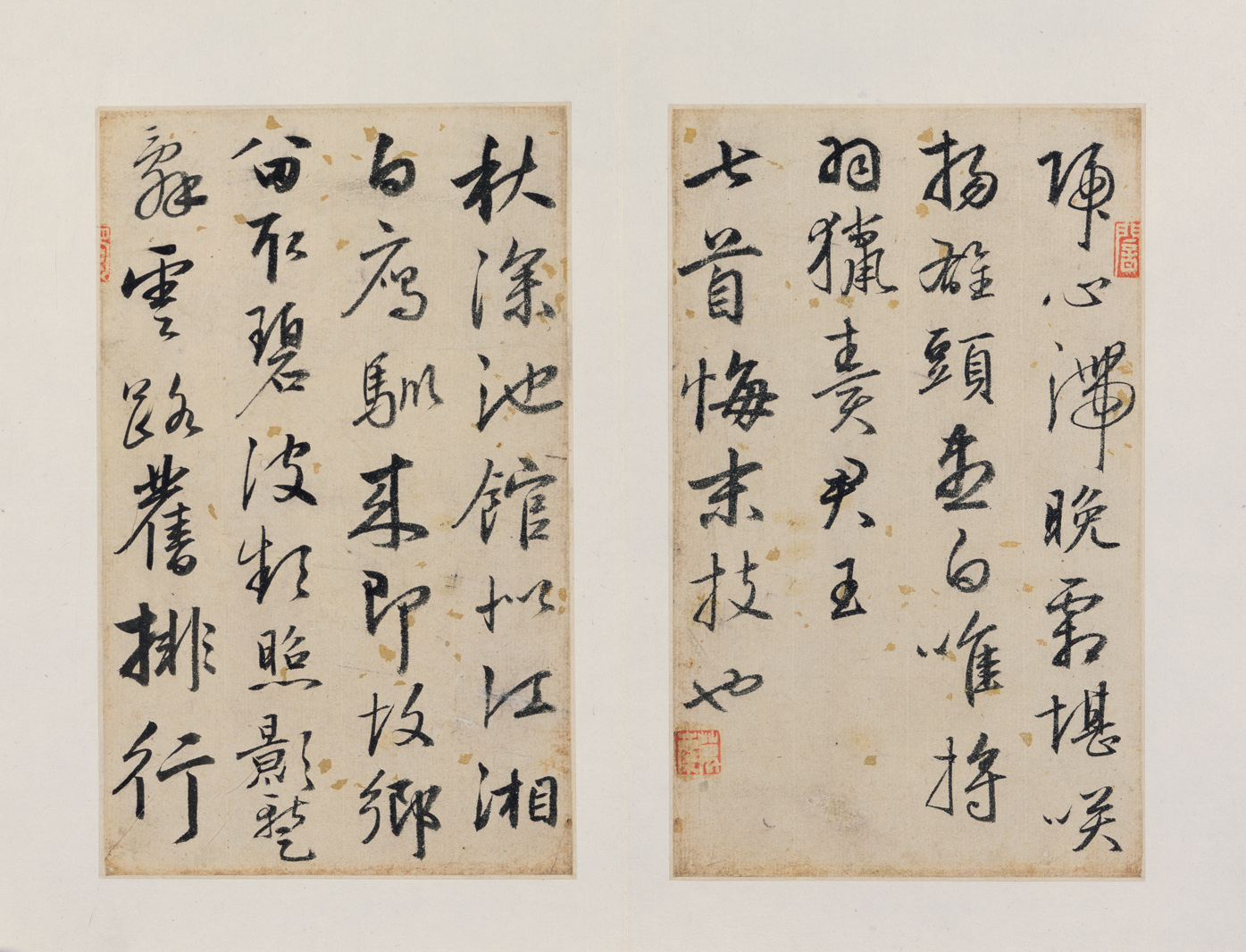 近墨堂書法研究基金會所收藏的陸深《白雁詩》冊,一直流傳於民間,未收入於清宮內府,所以整幅作品上沒有清宮的收藏璽,但不影響其文物的珍貴價值。對於古代傳世於今的作品,多會以流傳有緒的重要書畫著錄來檢證作品的真確性,於是記載於《式古堂書畫匯考》與《石渠寶笈》的陸深《白雁詩》手卷,似乎比較有較高的名聲。然而,有另一種具有說服力的檢證材料,卻比較少人所使用,即是和作品出現時代相近的刻帖,之所以少引用,主要是刻帖流傳的數量會遠比文字著錄還少得許多。令人可喜的是,陸深《白雁詩》冊正好刻於晚明的《寶翰齋帖》中。(圖1)《寶翰齋帖》全名《寶翰堂國朝書法》,選編者茅一相,刻者章田、馬士龍、龍榮甫。茅一相,字國佐,號泰華,又號康伯,浙江歸安人。浙江歸安中茅姓,時間又約在此期的有名人物為茅坤(1512-1601),茅坤的長兄毛乾(1506-1584)在萬曆十二年逝世時,撰有〈伯兄少溪公墓誌銘〉一文提到「子男二人,曰:一相、曰:一桂,俱太學生,可知茅坤是茅一相的叔父。