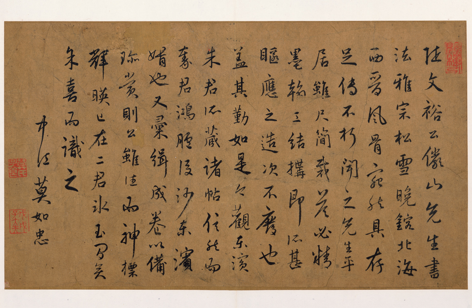 陸深對趙孟頫的看法其實不多,有「書法弊於宋季,元興,作者有工,而以趙吳興、鮮於漁陽為巨擘,終元之世,出入此兩家」的看法,承認趙孟頫的書法地位。趙孟頫書法以行書為主,鮮于樞的書風則是以唐代懷素〈自敘帖〉的狂草風格為主而更加規矩,陸深「尺簡裁答,必精墨翰、工結構,即所甚暱,應之造次不廢也」,可知是性格嚴謹之人,所以在書風的選擇上則會以筆性相近的趙孟頫為主。莫如忠的題跋加上了陸深晚年對於唐代書法家李邕的學習,極力推崇吳門書法的王世貞(1526-1590),對陸深的書法特色的描述: