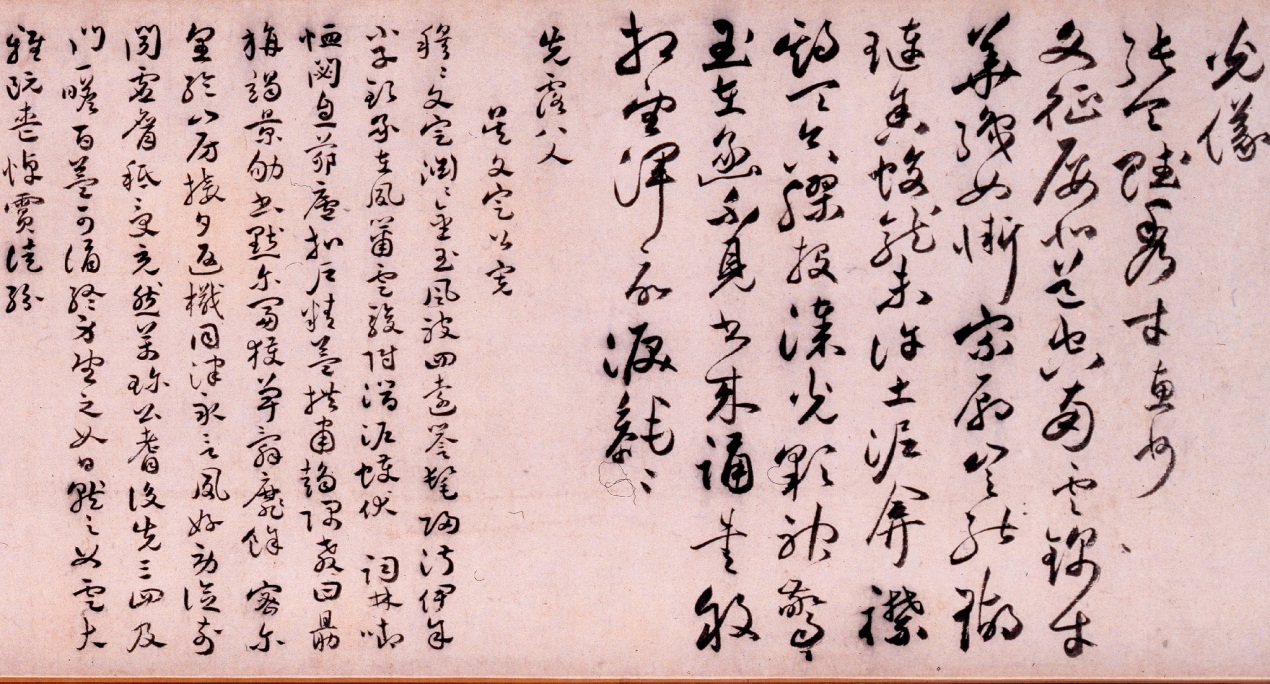 可知祝允明半年前回鄉小住時,“昨歸吳,知友多索書”而作,以山谷筆意“戲寫”正與《書道全集》所載合。此時祝允明剛開始嘗試融入黃庭堅草書筆意,此卷與上博的《前後赤壁賦》比較,其大草尚未成熟。因此筆者推測,此件是這三件署款雙胞胎偽作的真正的母本。因為祝允明不可能在這一年為謝元和寫兩次以上相同內容、跋文相同的詩卷,我相信這件作品全貌曝光時,可以印證我的推測。但目前為止,線索僅僅到此。雖尚未能證明這件是真跡,但這卷為真跡的概率遠遠高於前述三件。因此可以肯定,前三件偽祝書標準。