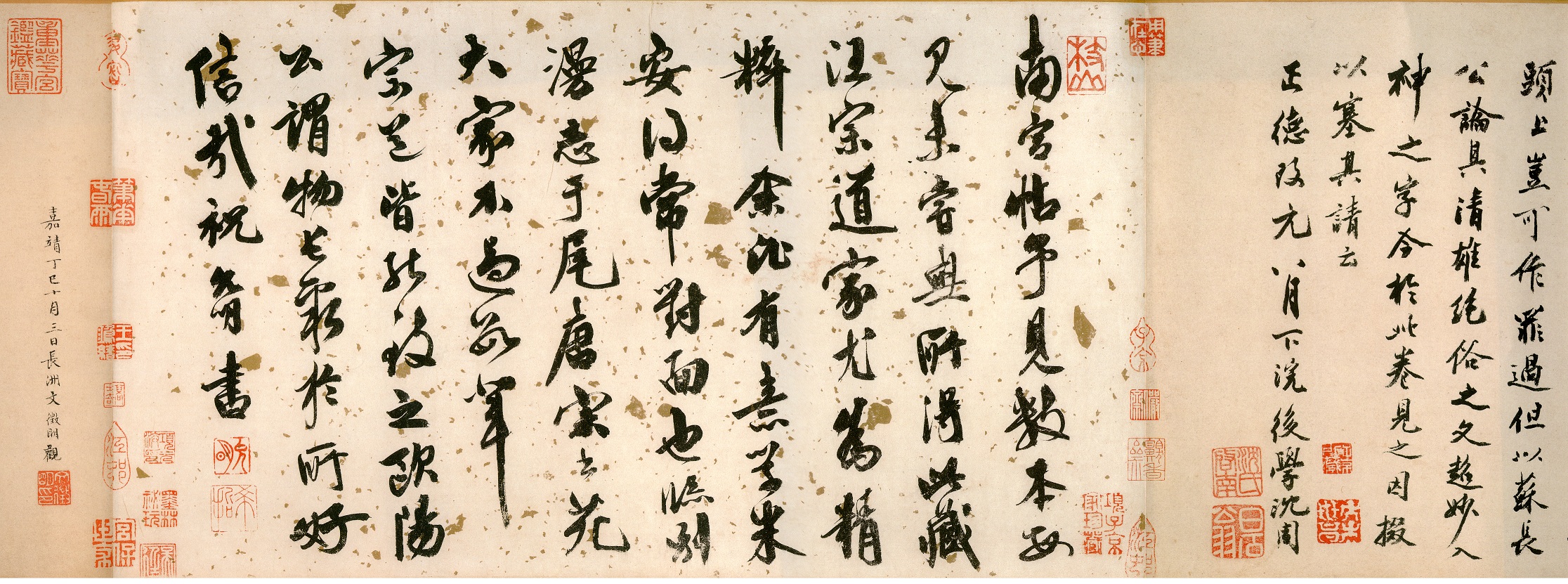 對於故宮《自書詩卷(歌風臺)》與黑博《前後赤壁賦》的比較,其實還有一個更有力的證據,證明後者必偽,可惜未被戴先生察覺,兩卷跋語都寫道:“但苦紙長未能滿”,可以知道,枝山翁正是為了將多出來的長紙寫盡,才寫出如此長跋,這種情形在祝允明書法中不止一次出現。再來比較這兩卷正文結束後的余紙長度:故宮卷尚餘四尺左右(以全卷24x656.5cm推算),作者為將余紙寫完,而且字還故意寫大。再來看黑博卷,正文結束時,余紙只有一尺左右(全卷33.7x393.5cm,可以推算),跋文還故意縮小字體,卻照抄“但苦紙長未能滿”,還將“雲莊口誦予詩” 改為:“復賦多寫一句”。但離奇的是,賦文中卻怎麼也找不到這“多寫一句”。戴先生失察也。