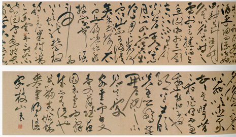 這兩件相同自跋的作品,正好顯示的是藝術水平懸殊。與戴先生的判斷相反。筆者堅信大多數書法鑒賞家都會認為,《歌風臺》卷的書法藝術水平遠遠高於黑博所藏《前後赤壁賦》。而且還可以比較,同樣是寫《前後赤壁賦》,黑博卷更無法與另一件標準器——上博藏草書《前後赤壁賦》的書法水平相提並論。上博此卷《前後赤壁賦》為何是標準器,後文闡述(圖4)(注18)。