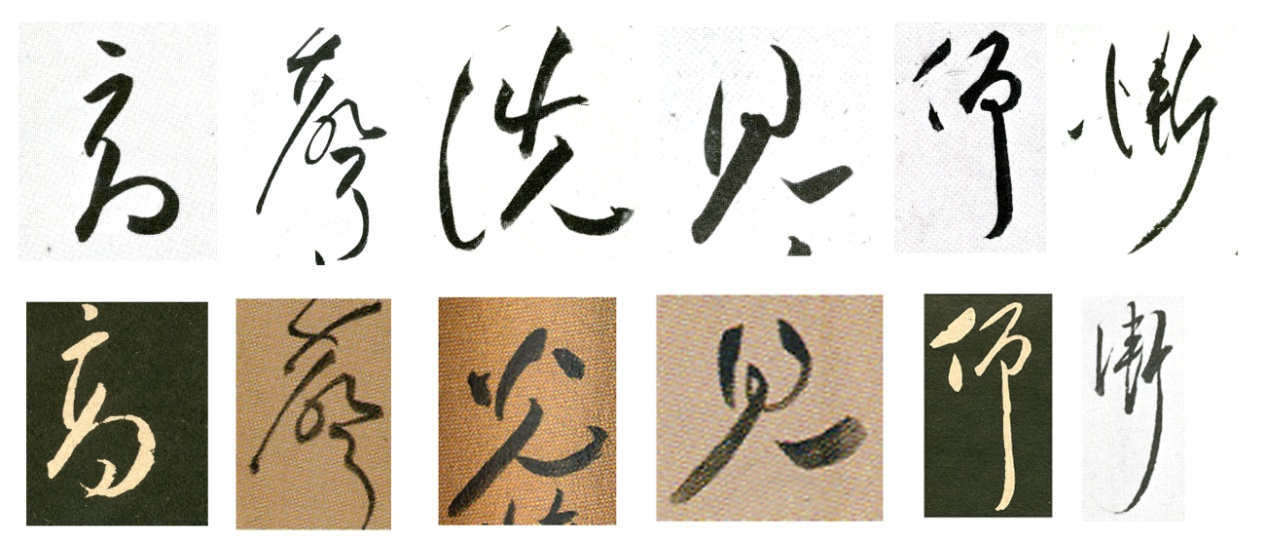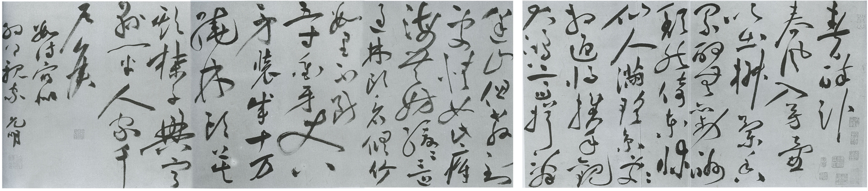對於蕭燕翼先生的結論,我一直心存疑意,認為兩件皆偽的可能性更大,原因是:這卷《大字草書》以及蕭先生作為同期參照的幾件作品,不僅與《小字草書》疑似同人所書,都顯出筆法結字軟熟的形態。而且蕭先生的推論邏輯,也有着與戴立強先生相似的缺陷,這種邏輯合理的前提是:作為比對的另一件作品,必須是經過認證的“標準器”,而不是由前輩鑒定家認可。