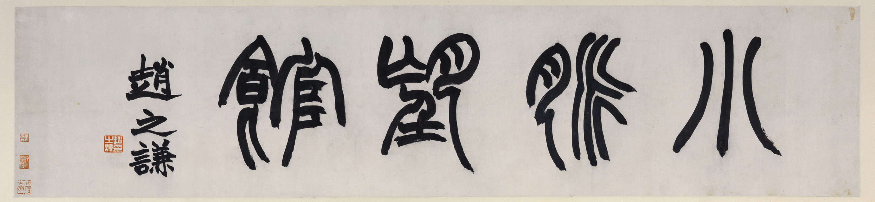 潘祖蔭(1830-1890),字東鏞,號伯寅,又號鄭盦,江蘇吳縣人。大學士潘世恩(1769-1854)之孫,道光二十八年(1848)潘世恩八十壽誕,皇帝賞賜潘祖蔭為舉人。咸豐二年(1852),成一甲三名進士,即探花。趙之謙和潘祖蔭的相識,是同治二年(1863)由浙江紹興同鄉的藏書家周星譽在北京所引薦,周星譽家族「傳忠堂」的藏書是趙之謙早年自修時的圖書館,趙之謙在此涉獵大量的金石學知識。趙之謙上北京參加進士考試,有四次:同治二年、同治四年、同治六年至八年、同治十年至十一年。這段期間潘祖蔭所任的職務:同治二年署宗人府府丞、四年署禮部右侍郎、七年署吏部左侍郎,後調戶部右侍郎、八年署戶部左侍郎、十一年賞一品頂戴。趙之謙篆書「小脈望館」從線條表現、字型處理,以及簽名特徵來看,可歸於同治十年至十一年間,此時趙之謙四十三歲,潘祖蔭擔任戶部左侍郎。
