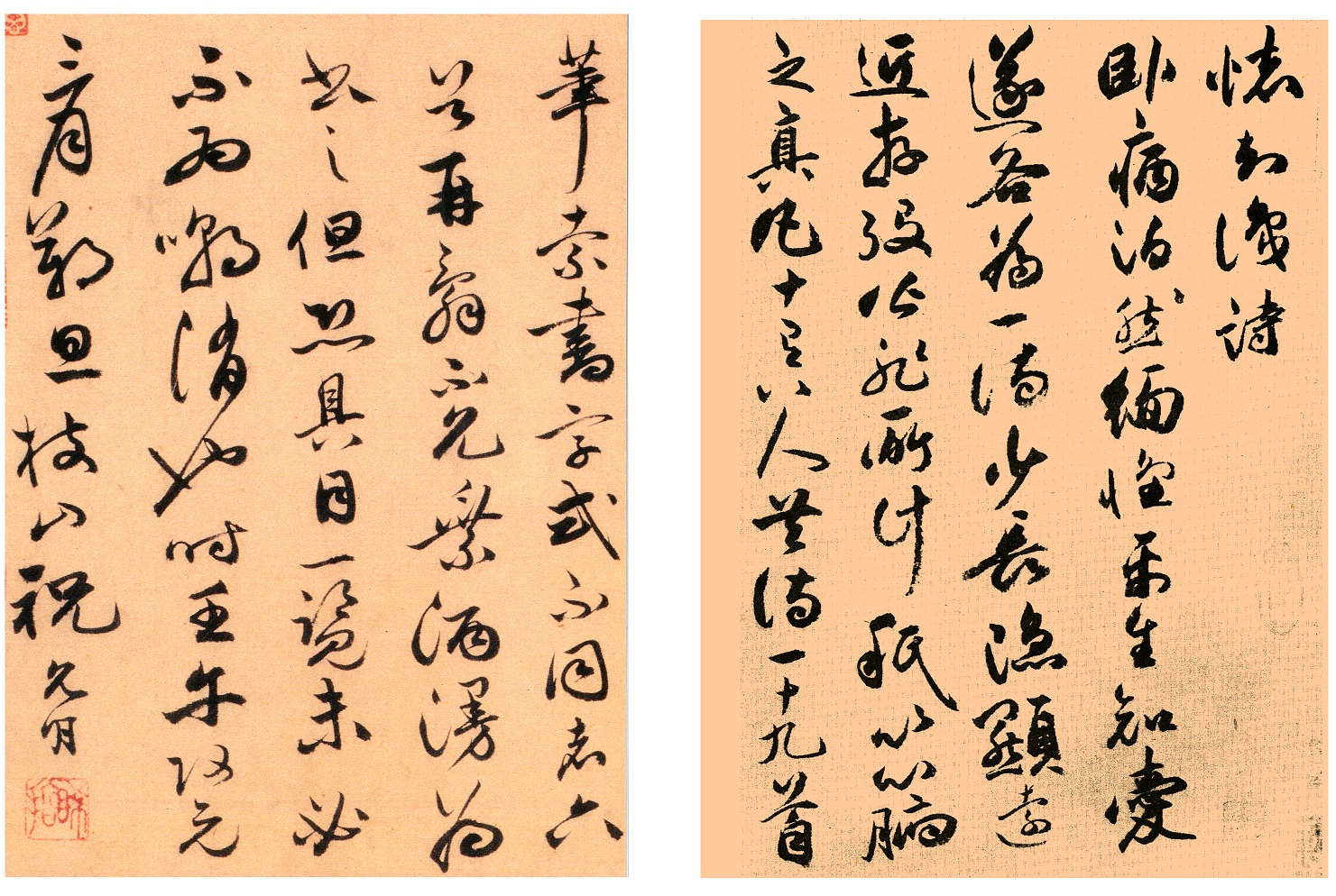 圖6,上博藏祝允明《和陶飲酒詩二十首》,上為“小字草書”下為“大字草書”,兩卷皆偽。