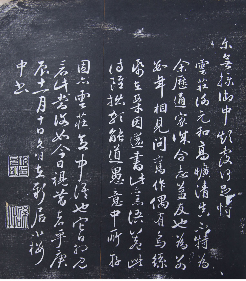 3. 戴先生文中指出:“所見近百件祝允明的作品,署款中,‘明’字作草書‘月’的僅有4件,皆存有疑問。可以認為,‘明’字之‘月’寫作草書的,並不符合書家署款的習慣。”這一論點顯然不能成立:文徵明父子於嘉靖二十六年(1547年)所刻《停雲館帖》中祝允明書《書述》,落款“明”字即為草書“月”(圖3)。